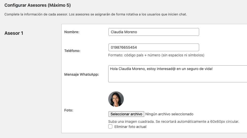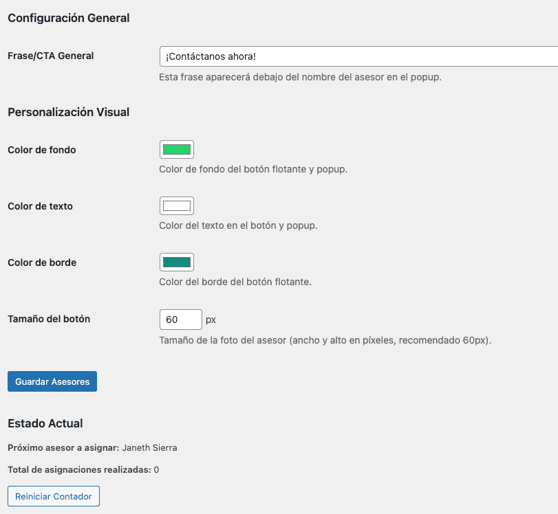 Gestiona a tus asesores y todas las configuraciones desde un panel intuitivo en WordPress, sin necesidad de código.