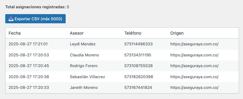Con Agente360 v2.1, no solo optimizas la comunicación con tus clientes, sino que también obtienes una visión clara del rendimiento de tus asesores. Nuestro módulo de reportes integrado te permite monitorear en tiempo real el total de asignaciones realizadas y visualizar las últimas interacciones, incluyendo la fecha, el asesor asignado, su número de contacto y la URL de origen de cada chat. Además, para un análisis más profundo, puedes exportar fácilmente hasta 5000 registros a un archivo CSV, compatible con Excel o Google Sheets, facilitando la toma de decisiones estratégicas y la optimación de tus campañas de marketing.